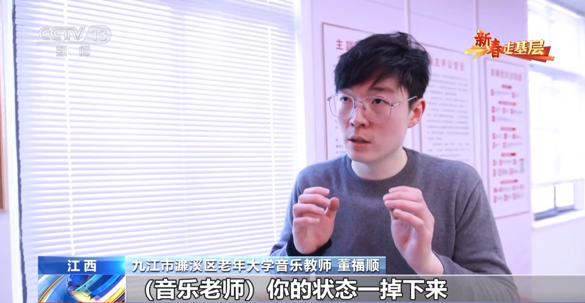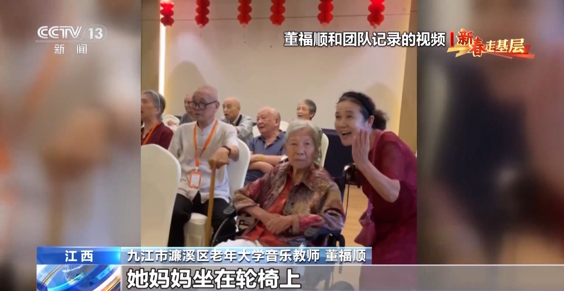 九江市濂溪區(qū)老年大學音樂教師 董福順:我去了之后,他們說我四十年沒有開口唱過歌,已經(jīng)很久很久,他們說都快忘了這首歌的歌詞了,你過來了,讓我想起了它。所以我覺得我又一次被認可了,我也覺得是他們在給我一點能量,當看著他們唱回憶起的這些歌曲的時候,他們坐直了,開始朝我揮手去唱,我覺得這件事做對了。