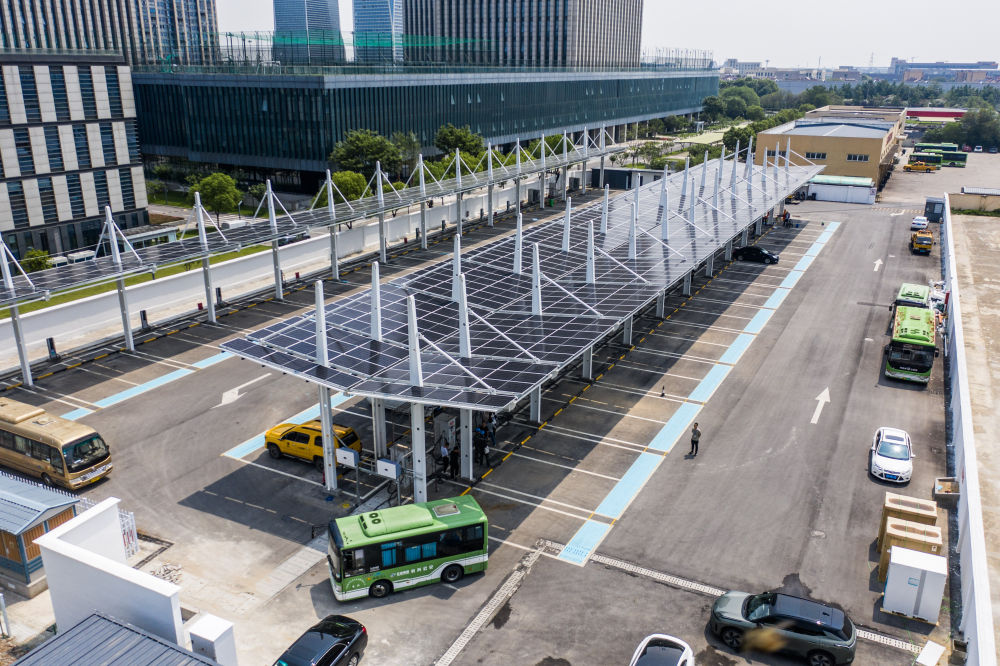 2025年5月27日拍攝的浙江省湖州市長興公交總站光儲充一體化公交充電站(無人機(jī)照片)。新華社記者 徐昱 攝