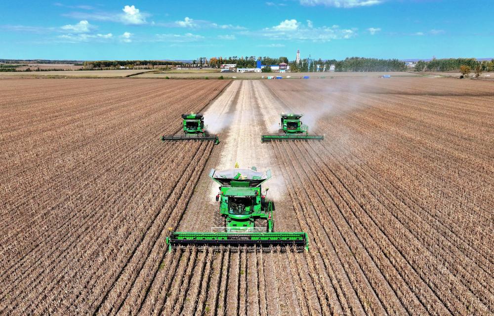 2025年9月29日,在北大荒集團(tuán)黑龍江尾山農(nóng)場有限公司第一管理區(qū),農(nóng)機(jī)進(jìn)行大豆收獲作業(yè)(無人機(jī)照片)。新華社發(fā)(陸文祥攝)