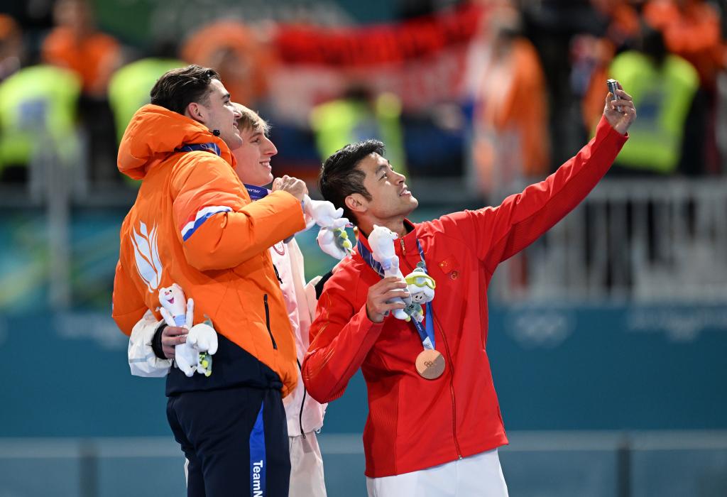 2月11日,冠軍美國選手斯托爾茲(中)、亞軍荷蘭選手德布(左)和季軍中國選手寧忠?guī)r在頒獎(jiǎng)儀式上自拍。新華社記者 武巍 攝