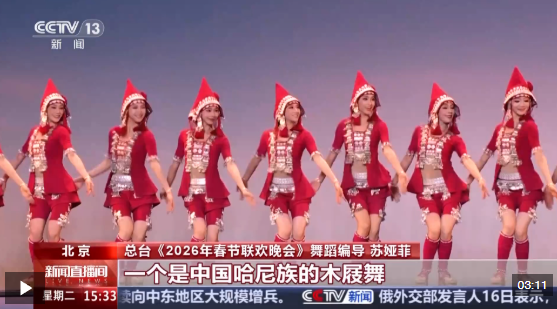 總臺《2026年春節(jié)聯(lián)歡晚會》舞蹈編導 蘇婭菲:這次的作品中有中國的兩個不同的舞種,一個是哈尼族的木屐舞,一個是中國傈僳族的阿尺木刮,它也是國家級非遺。還有兩支來自國外不同的團隊,一個來自匈牙利,表演的是匈牙利的萊蓋涅什,是他們的傳統(tǒng)民族舞蹈,一個是西班牙的一支舞蹈團,表演的就是弗拉門戈。