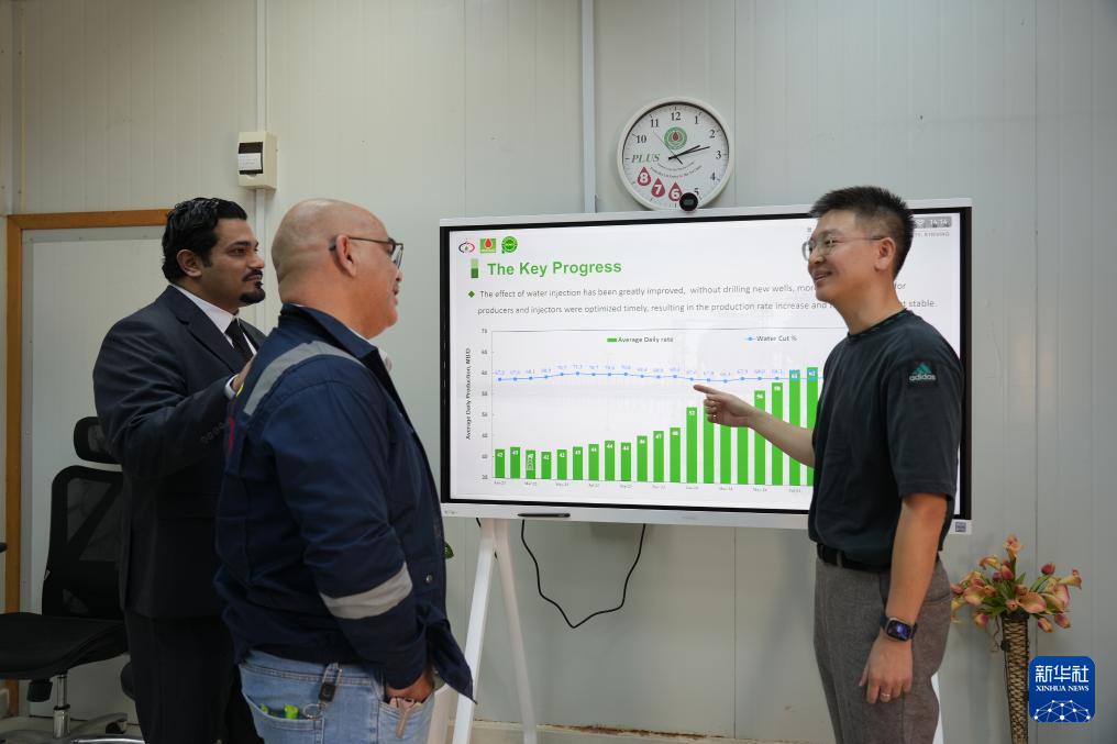 2月16日,在伊拉克瓦西特省艾哈代布油田,中國綠洲石油公司計(jì)劃部副經(jīng)理劉學(xué)(右一)與伊拉克合作伙伴梳理生產(chǎn)經(jīng)營任務(wù)完成情況。新華社記者 段敏夫 攝