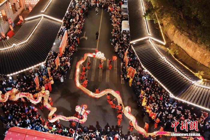 夜色中,鼓聲在街道上漸漸密集。伴隨著鼓點,兩條金黃草龍翻騰而來,龍頭高昂,龍身起伏,數(shù)十名舞龍者腳步整齊,帶動整條草龍如浪般滾動。