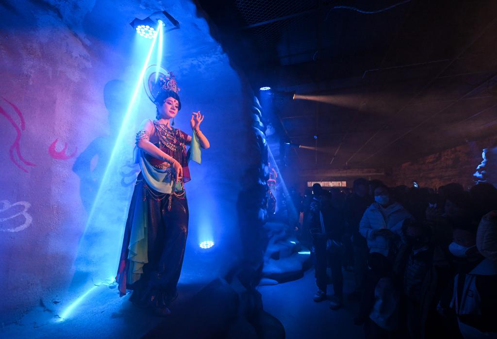 馬年春節(jié)期間,寧夏銀川市賀蘭山下格外熱鬧。走進西夏陵博物館后數(shù)百米長的廊道,游客仿佛穿越回千年前的西夏——身著各民族傳統(tǒng)服飾的“商賈”沿街叫賣,“麻魁”女兵英姿颯爽,西夏壁畫中的“飛天”在神秘?zé)熿F與燈光中翩躚起舞……