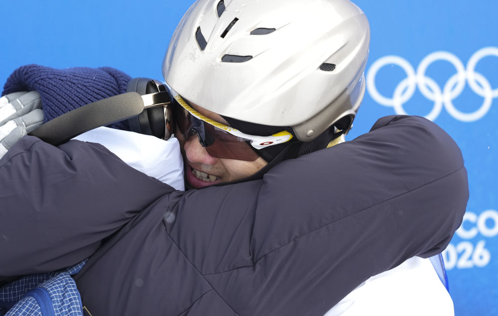 當(dāng)王心迪在米蘭冬奧會(huì)自由式滑雪男子空中技巧決賽中穩(wěn)穩(wěn)落地,滑到等分區(qū),妻子徐夢(mèng)桃已從場(chǎng)邊飛奔而來(lái),與他緊緊相擁。