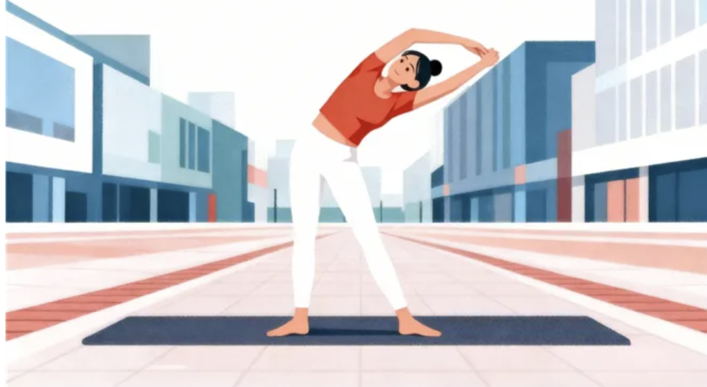 2.側(cè)向伸展:站立位,雙腳與肩同寬,雙手交叉舉過頭頂;向左側(cè)緩慢彎腰,直到右側(cè)腰部有拉伸感(不要扭轉(zhuǎn)身體),保持15-20秒,回到中立位后換側(cè)重復(fù),每側(cè)2-3組。