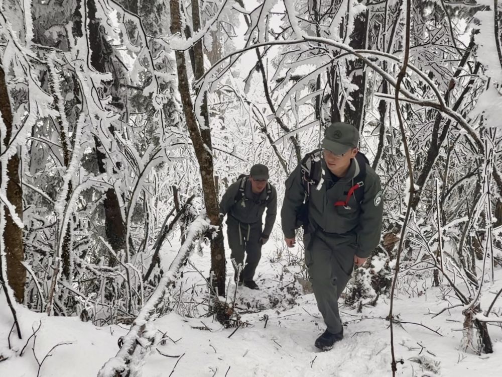 筒靴有點(diǎn)大,走起路來鞋底有些打滑,但踩進(jìn)深深的雪地里確實(shí)不濕腳了。王偉已經(jīng)在山里摸爬滾打了七年,毛軍剛?cè)肼氁荒辏瑑蓚€人是巡山的“搭檔”。一人負(fù)責(zé)巡護(hù),另一人則負(fù)責(zé)科研,是站里常見的組合。
