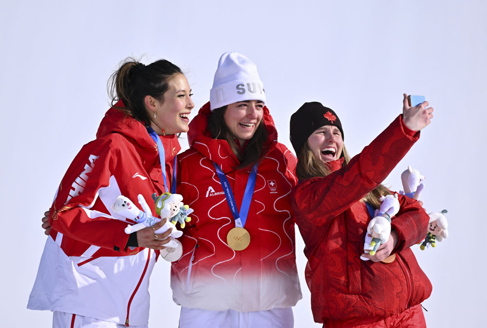 2月9日,瑞士選手瑪?shù)贍柕隆じ窭啄拢ㄖ校?,中國選手谷愛凌(左)和加拿大選手梅根·奧爾德姆在領(lǐng)獎(jiǎng)臺(tái)上合影。新華社記者 張宏祥 攝