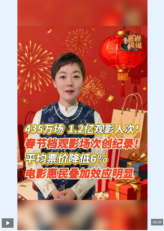2026馬年春節(jié)檔圓滿收官,精彩表現彰顯了文化惠民實效與市場的強勁活力。從充足供給、親民票價到下沉市場發(fā)力,電影產業(yè)以惠民政策為抓手,聯(lián)動多方釋放消費潛力,帶動多元業(yè)態(tài)融合發(fā)展。中國電影穩(wěn)步邁向高質量發(fā)展,持續(xù)為群眾美好生活添彩,為文化繁榮與經濟增長注入新動能?! ?/p>