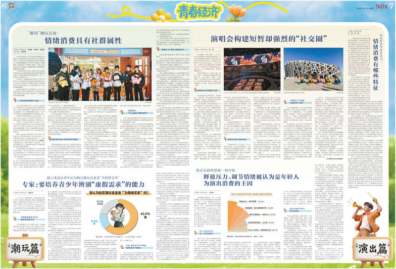 消費(fèi)端彰顯“青春經(jīng)濟(jì)”活力。青年消費(fèi)者追求的不再是單一產(chǎn)品,而是更加注重情感共鳴、文化認(rèn)同和價(jià)值表達(dá),由“性價(jià)比”轉(zhuǎn)向“心價(jià)比”。中青報(bào)及中青校媒記者調(diào)研發(fā)現(xiàn),61.2%的受訪青年會(huì)為了釋放壓力、調(diào)節(jié)情緒而為演出花錢,62.5%的受訪青年認(rèn)為購(gòu)買潮玩盲盒是在為情緒買單。國(guó)研新經(jīng)濟(jì)研究院創(chuàng)始院長(zhǎng)朱克力認(rèn)為,年輕一代的消費(fèi)正變得越來越多元化、個(gè)性化,充滿文化感、設(shè)計(jì)感和科技感。“這些特性與社會(huì)躍遷密切相關(guān)。”