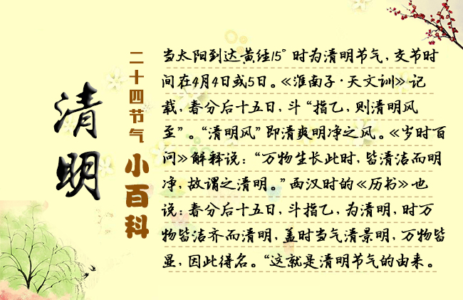 節(jié)選自《二十四節(jié)氣志》/宋英杰 4月5日前后為清明節(jié)氣,氣清景明之意,正是鳥語花香的盛春時(shí)節(jié)。“言萬物去故而從新,莫不鮮明之謂也?!薄叭f物生長此時(shí),皆清凈明潔,故謂之清明?!鼻迕髦惚碚髁诉@一時(shí)節(jié)的天氣是清新、明媚、和暖的。