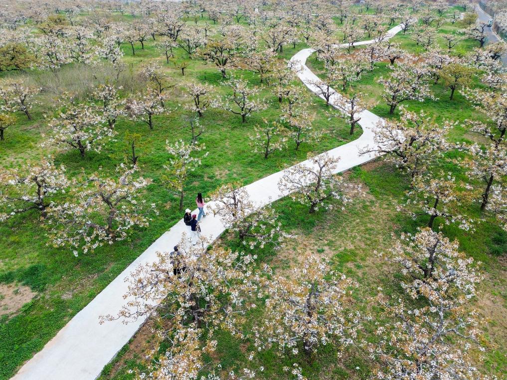 4月3日,游客在梨園內(nèi)賞花(無人機(jī)照片)。時(shí)下,山東省滕州市柴胡店鎮(zhèn)近萬畝梨園進(jìn)入盛花期,梨花競相綻放。新華社記者 朱崢 攝