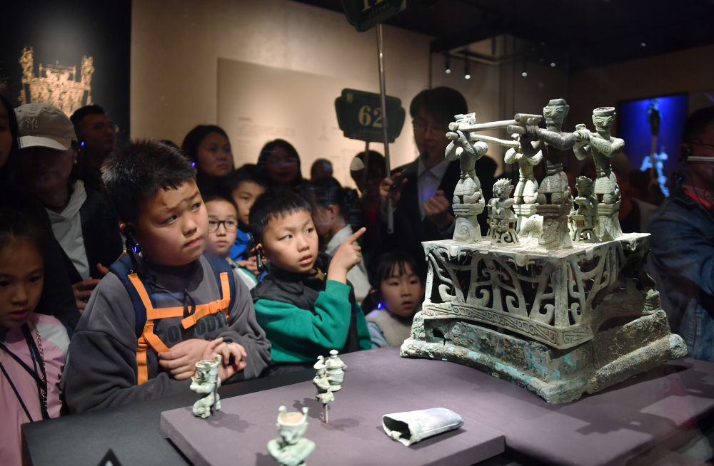 4月3日,小朋友在三星堆博物館觀看展品。新華社記者 盧哲 攝