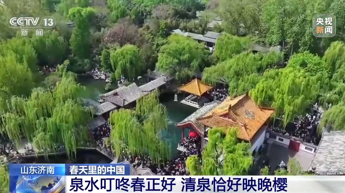 在山東濟(jì)南,游客聽(tīng)泉、賞花、品春色,感受獨(dú)具特色的婉約韻味。