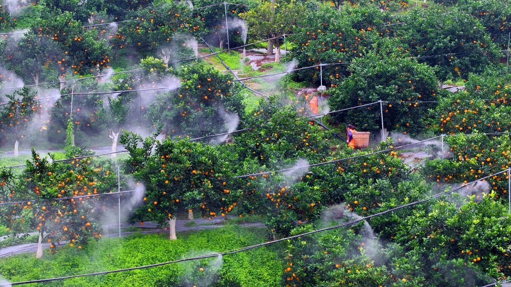 在重慶江津區(qū)夏壩鎮(zhèn)太陽(yáng)橙基地,管護(hù)人員利用微彌霧系統(tǒng)澆灌橙園。新華社發(fā)
