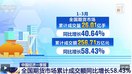 數(shù)據(jù)顯示,1-3月全國期貨市場累計(jì)成交量為26.01億手,累計(jì)成交額為256.71萬億元,同比分別增長40.64%和58.43%。