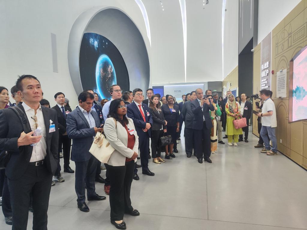 外國在港領(lǐng)團(tuán)和商界參訪團(tuán)在廣東省中山市翠亨新區(qū)規(guī)劃館參觀(4月9日攝)。新華社發(fā)(王昕怡攝)