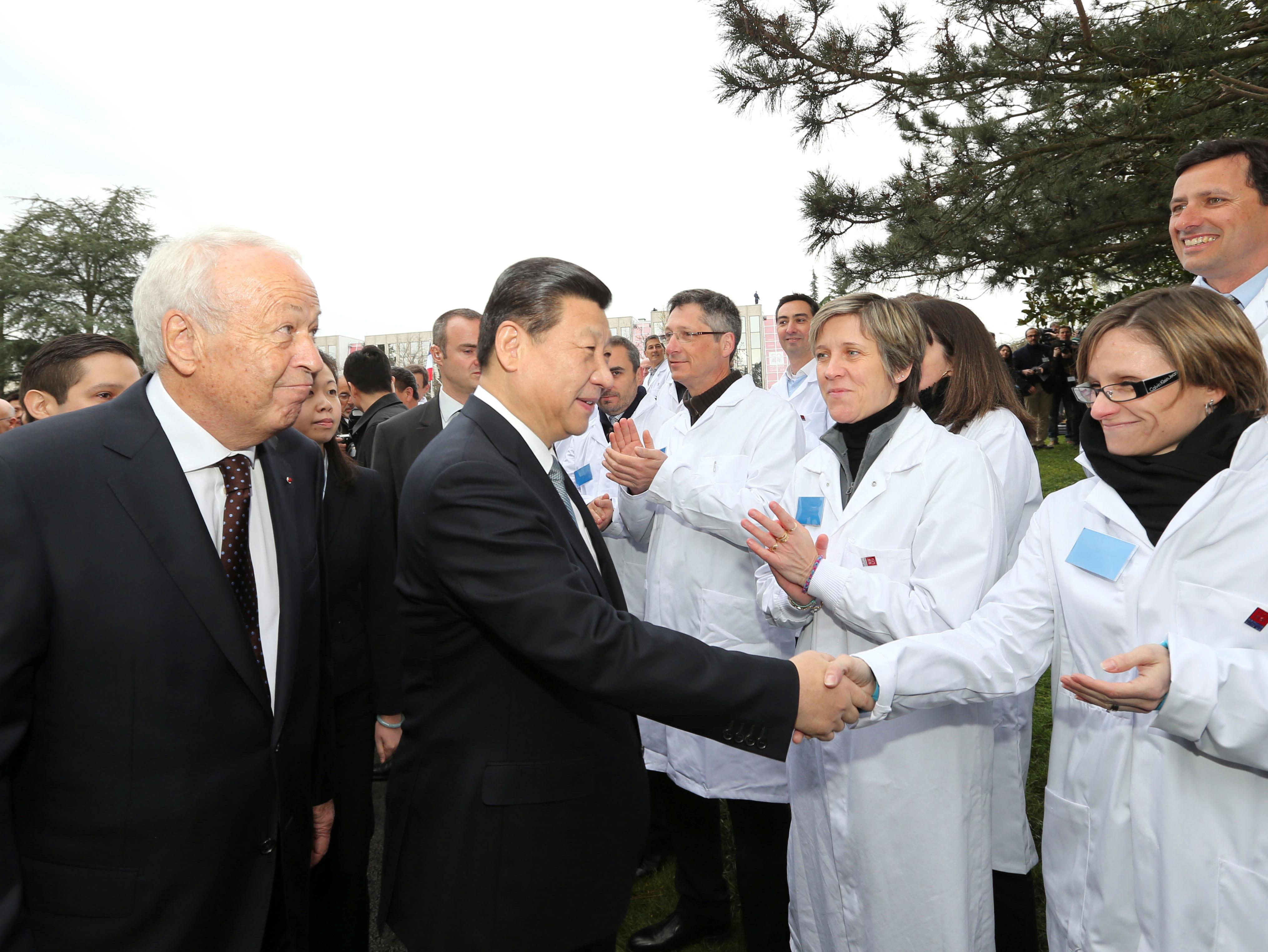 2014年3月26日,習(xí)近平主席在法國里昂參觀梅里埃生物科研中心,與科研中心員工握手。