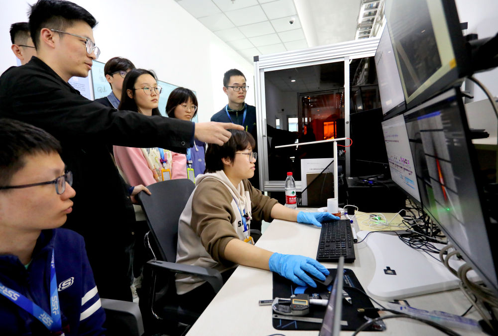 2024年4月6日,在位于安徽合肥的中國(guó)科學(xué)技術(shù)大學(xué),安徽省先進(jìn)功能高分子薄膜工程實(shí)驗(yàn)室團(tuán)隊(duì)成員在檢修自主研制的高分子薄膜原位雙向拉伸實(shí)驗(yàn)設(shè)備的電氣控制系統(tǒng)。