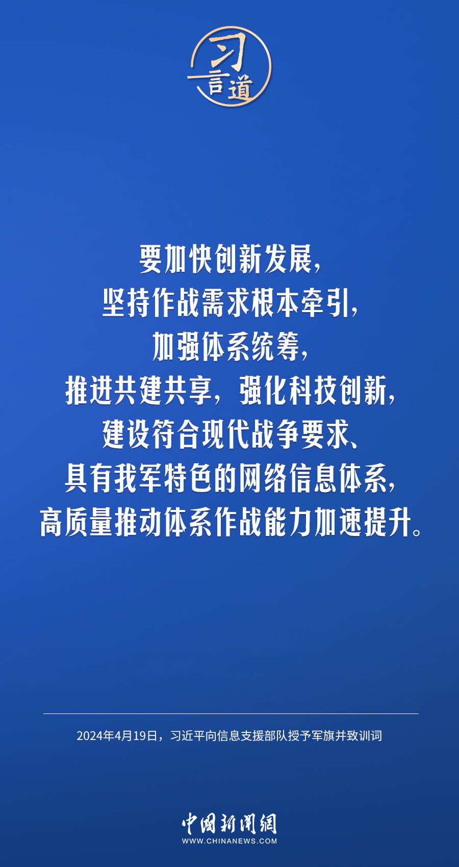 中國人民解放軍信息支援部隊成立大會19日在北京八一大樓隆重舉行。中共中央總書記、國家主席、中央軍委主席習近平向信息支援部隊授予軍旗并致訓詞,代表黨中央和中央軍委向信息支援部隊全體官兵致以熱烈祝賀。他強調(diào)——
