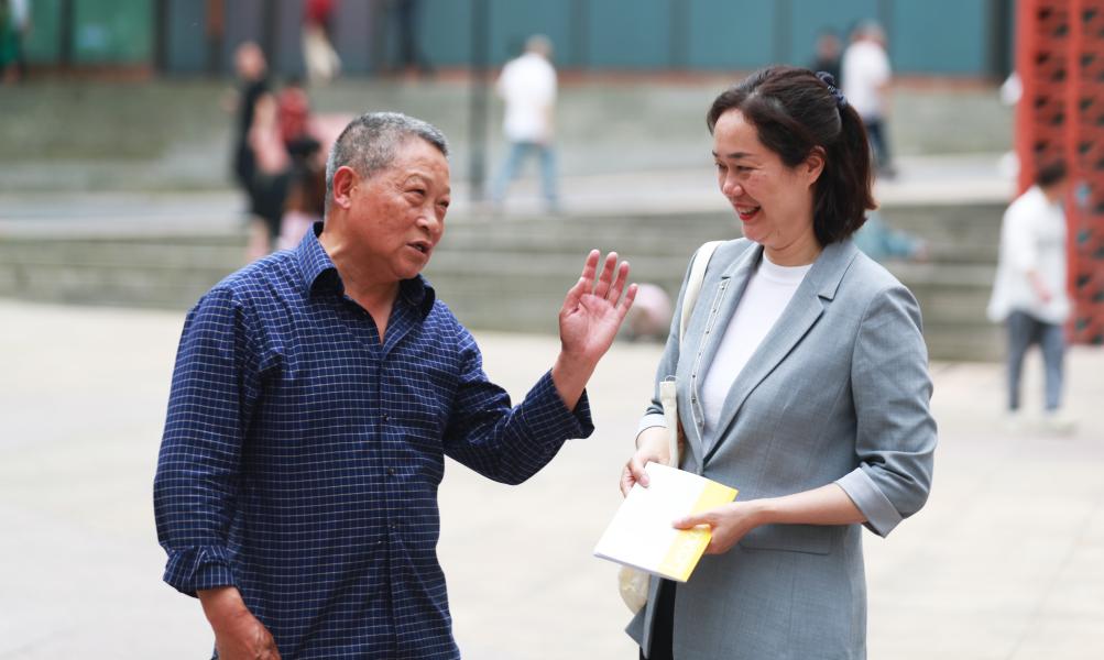 4月23日,伍成莉與社區(qū)居民交談。