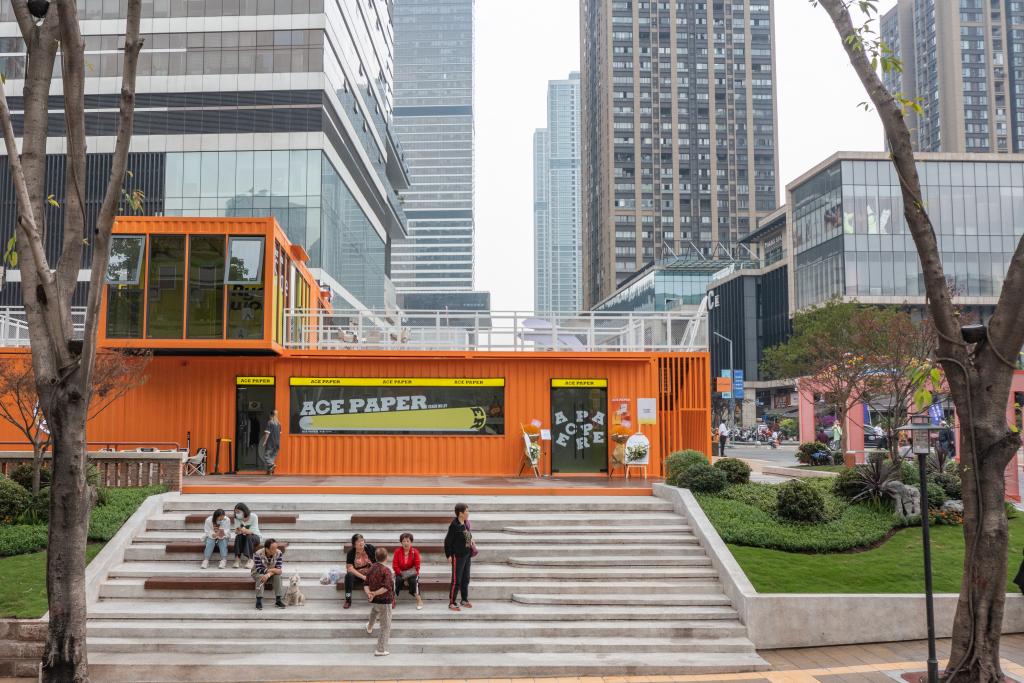 2023年4月28日,在竣工亮相的民主村片區(qū)城市更新項(xiàng)目(一期),人們?cè)谝惶幑部臻g休息(無人機(jī)照片)。