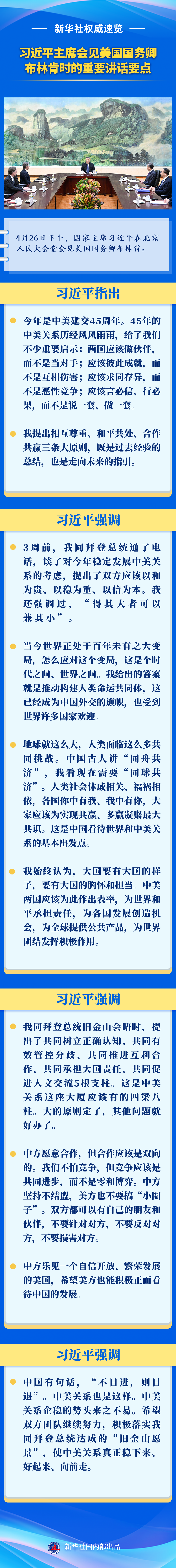 4月26日下午,國(guó)家主席習(xí)近平在北京人民大會(huì)堂會(huì)見(jiàn)美國(guó)國(guó)務(wù)卿布林肯。來(lái)看習(xí)近平主席的重要講話(huà)要點(diǎn)。