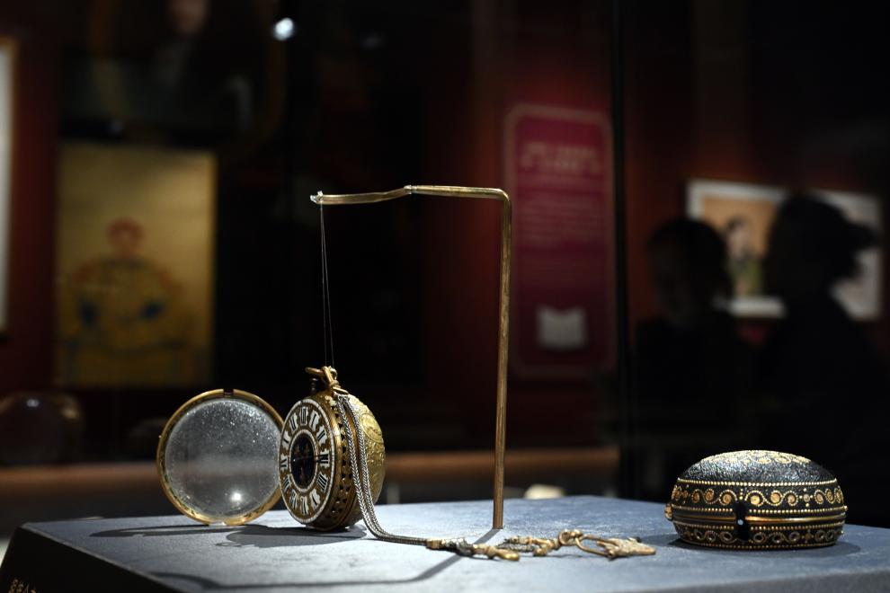 這是展出的故宮博物院藏銅鍍金殼開光人物像懷表。2024年4月1日,作為中法文化旅游年的重要項(xiàng)目,“紫禁城與凡爾賽宮——17、18世紀(jì)的中法交往”展覽開幕式在北京故宮文華殿舉行,展出大約200件文物精品。(新華社記者金良快攝)