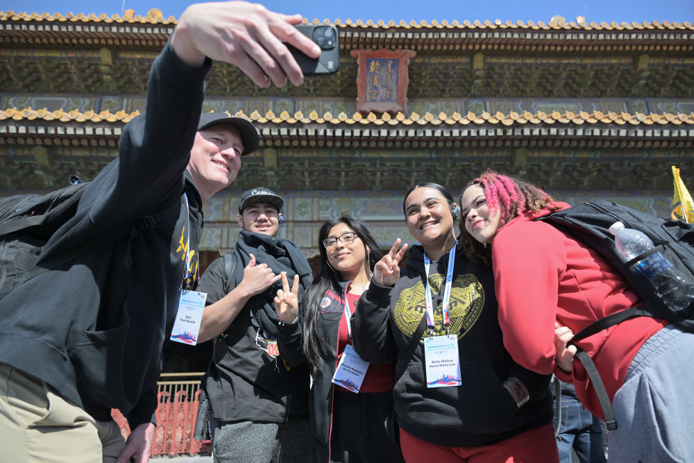 2024年3月19日,美國華盛頓州中學(xué)生代表團(tuán)的成員在故宮乾清宮前合影留念。 新華社記者 李鑫 攝