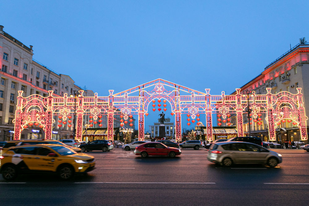 2024年2月9日,在俄羅斯首都莫斯科,車輛在中國新年主題裝飾前駛過。當(dāng)日,“莫斯科的中國新年”文化活動在俄羅斯首都莫斯科市中心啟動。 新華社記者 白雪騏 攝