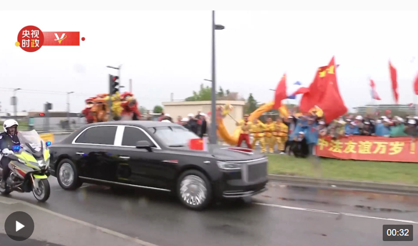 當(dāng)?shù)貢r(shí)間5月5日下午,國家主席習(xí)近平乘專機(jī)抵達(dá)巴黎。從機(jī)場前往下榻酒店途中,包括華人華僑和中國留學(xué)生代表在內(nèi)的歡迎人群揮舞著中法兩國國旗,敲鑼打鼓,舞龍舞獅,熱烈歡迎習(xí)近平主席到訪。
