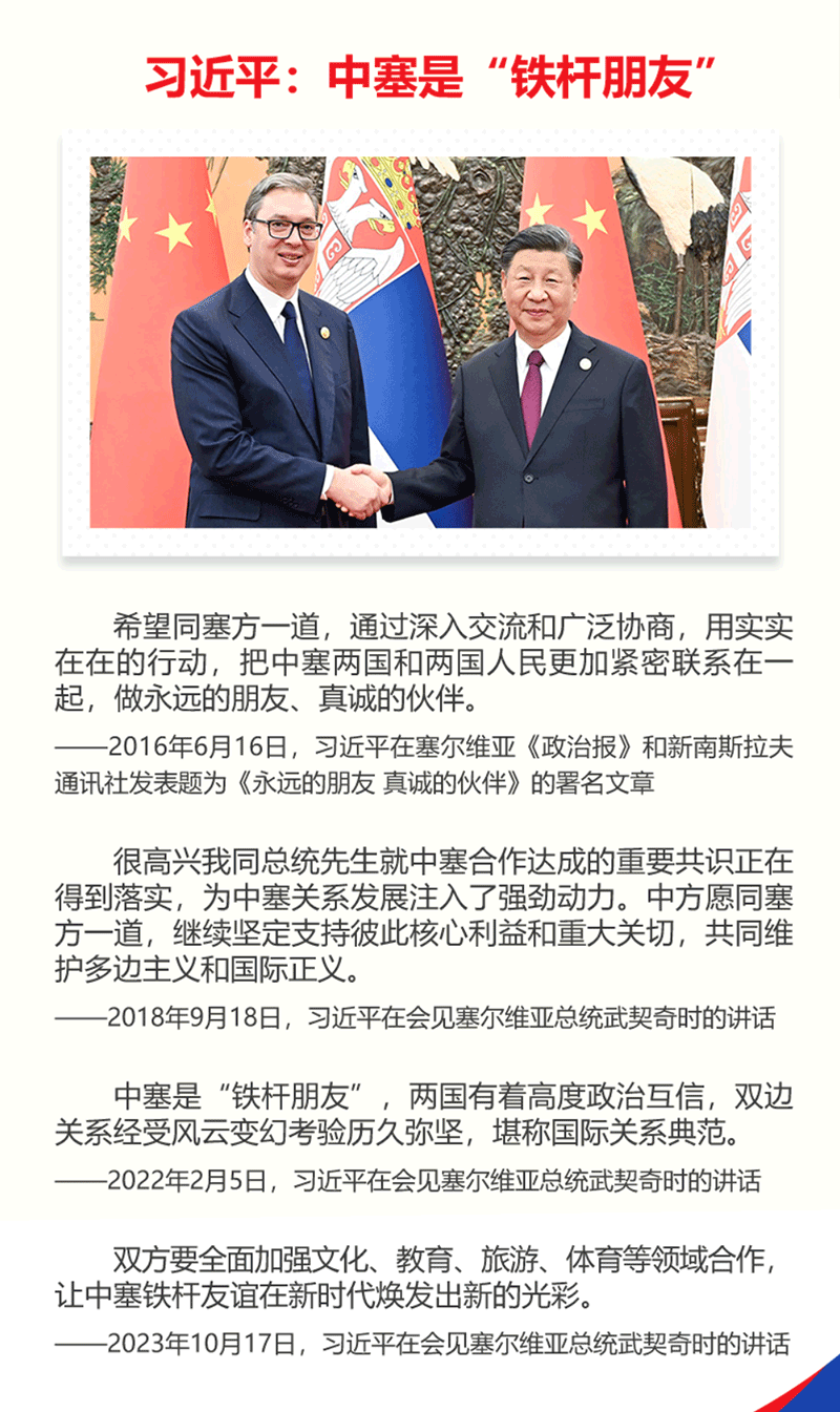 這是時(shí)隔近八年,習(xí)主席再次對(duì)塞爾維亞進(jìn)行國事訪問。中塞是“鐵桿朋友”,習(xí)主席指出,希望同塞方一道,通過深入交流和廣泛協(xié)商,用實(shí)實(shí)在在的行動(dòng),把中塞兩國和兩國人民更加緊密聯(lián)系在一起,做永遠(yuǎn)的朋友、真誠的伙伴。