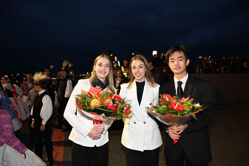 當?shù)貢r間5月8日晚,在匈牙利布達佩斯國際機場,匈牙利姑娘歐拉·塔瑪拉與匈中雙語學校兩名參加歡迎儀式的學生合影。新華社記者謝環(huán)馳攝