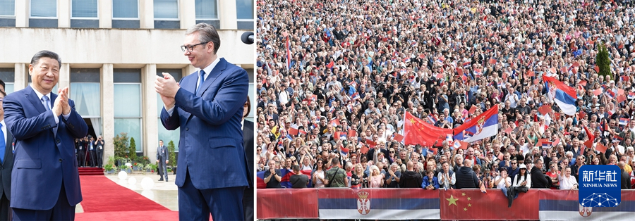 當(dāng)?shù)貢r間5月8日上午,國家主席習(xí)近平在貝爾格萊德塞爾維亞大廈同塞爾維亞總統(tǒng)武契奇舉行會談。會談前,武契奇陪同習(xí)近平來到政府大廈平臺(左圖)。大廈廣場上,一萬五千名塞爾維亞民眾揮舞中塞兩國國旗,對習(xí)近平表示最熱烈的歡迎(右圖)。(拼版照片) 新華社記者 黃敬文 丁海濤 攝