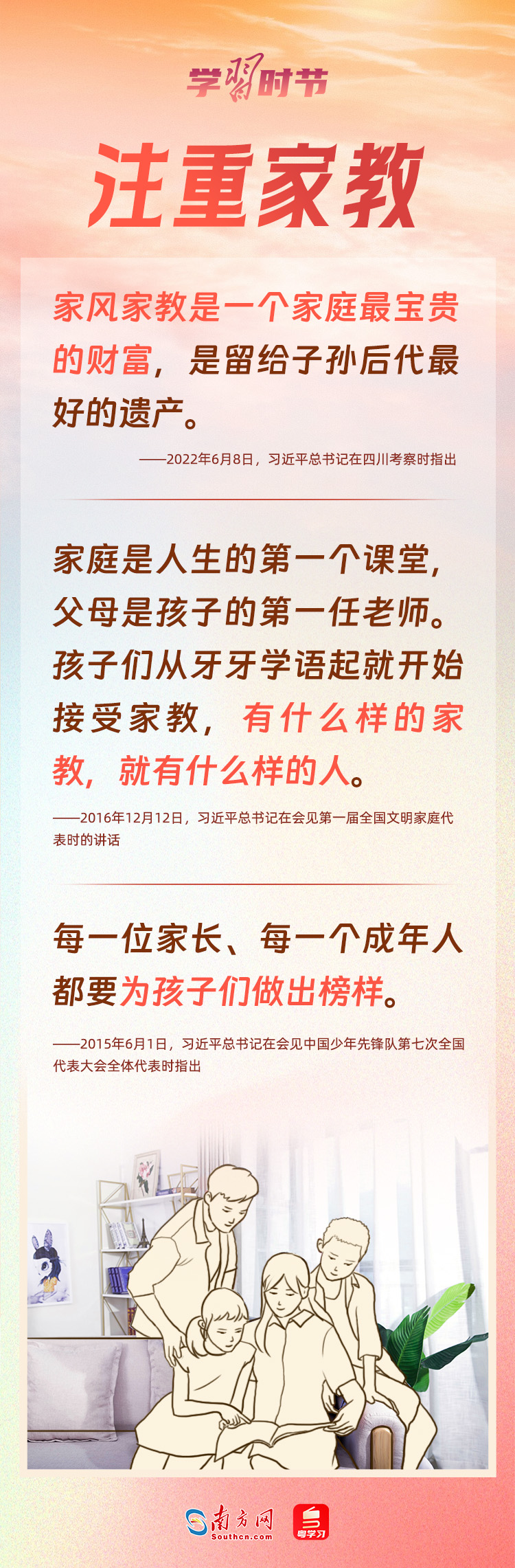 5月15日是國(guó)際家庭日。家庭是社會(huì)的細(xì)胞,是國(guó)家發(fā)展、民族進(jìn)步、社會(huì)和諧的重要基點(diǎn)。習(xí)近平總書(shū)記心中始終牽掛著千家萬(wàn)戶(hù),高度重視家庭、家教和家風(fēng)建設(shè),強(qiáng)調(diào)不論時(shí)代發(fā)生多大變化,不論生活格局發(fā)生多大變化,我們都要重視家庭建設(shè),注重家庭、注重家教、注重家風(fēng)。家庭和睦、家教良好、家風(fēng)端正,子女才能健康成長(zhǎng),社會(huì)才能健康發(fā)展。