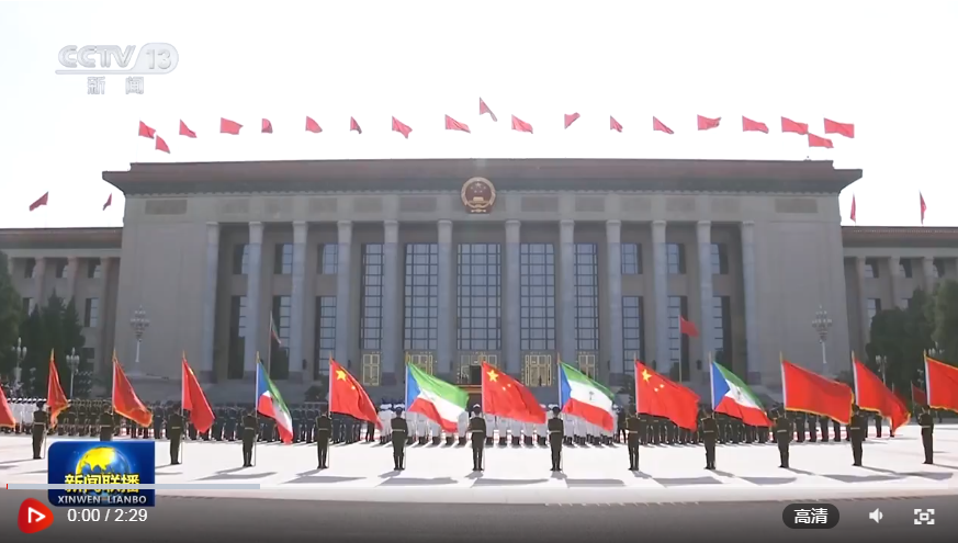 奧比昂抵達時,禮兵列隊致敬。兩國元首登上檢閱臺,軍樂團奏中赤幾兩國國歌,天安門廣場鳴放21響禮炮。奧比昂在習近平陪同下檢閱中國人民解放軍儀仗隊,并觀看分列式。