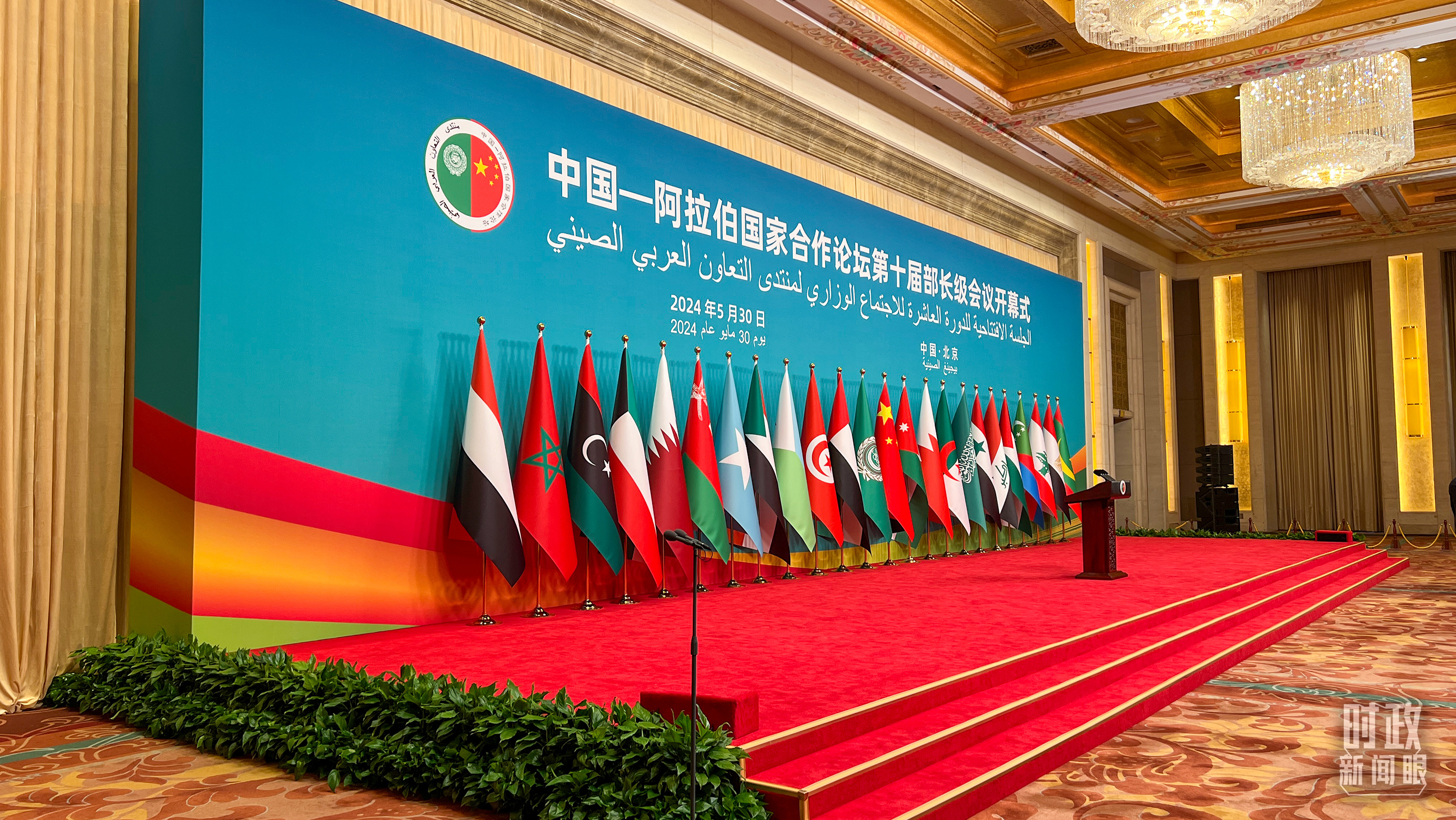 5月30日上午,北京釣魚臺芳華苑內(nèi),中國和22個阿拉伯國家國旗以及阿盟旗幟相映成輝。中阿合作論壇第十屆部長級會議開幕式在這里舉行。