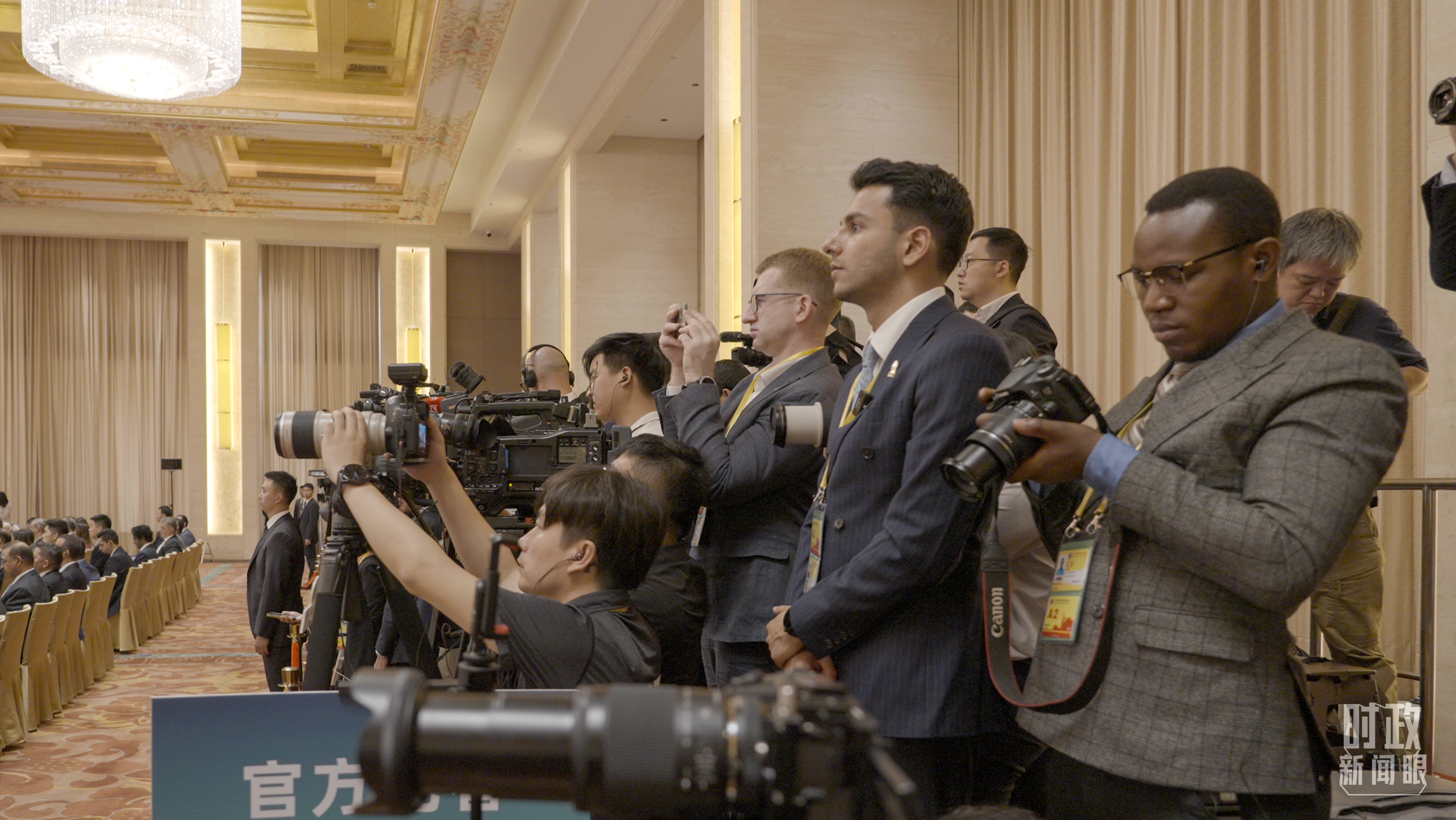 外國媒體拍攝現(xiàn)場旗陣。(總臺國廣記者李晉拍攝)