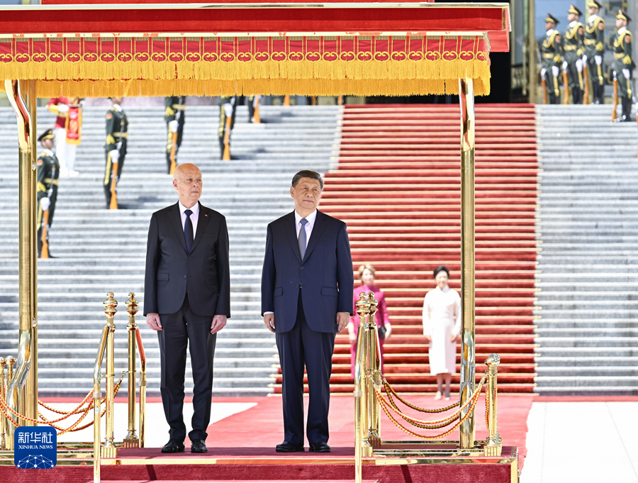 5月31日上午,國家主席習(xí)近平在北京人民大會堂同來華國事訪問并出席中國-阿拉伯國家合作論壇第十屆部長級會議開幕式的突尼斯總統(tǒng)賽義德舉行會談。這是會談前,習(xí)近平和夫人彭麗媛在人民大會堂東門外廣場為賽義德和夫人伊什拉芙舉行歡迎儀式。新華社記者 殷博古 攝