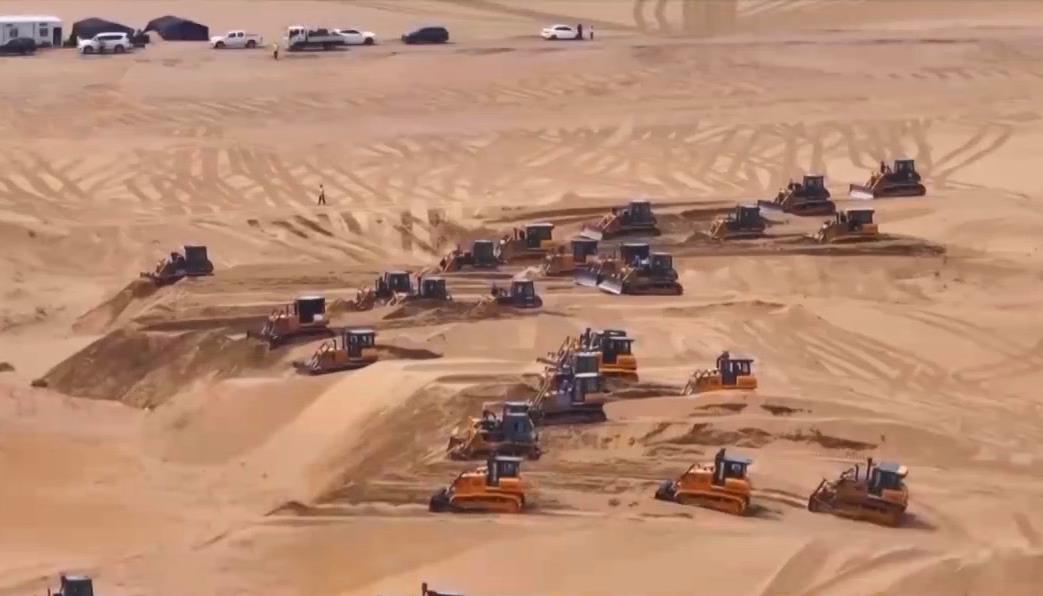 在內(nèi)蒙古鄂爾多斯的茫茫沙海中,近200臺推土機來回穿行,推平高低起伏、連綿不斷的沙丘,以便后續(xù)在此安裝光伏板。這正是當(dāng)下最新的光伏治沙模式中的一個環(huán)節(jié)。
