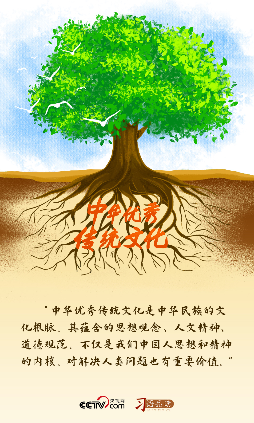 “根”屬于植物學(xué)名詞,具有吸收、儲(chǔ)存、輸送營(yíng)養(yǎng)并固著自身的功能。強(qiáng)大的根脈可以促進(jìn)植物不斷茁壯成長(zhǎng)??倳泴⒅腥A優(yōu)秀傳統(tǒng)文化比作中華民族的文化根脈,既強(qiáng)調(diào)了繼承和弘揚(yáng)中華優(yōu)秀傳統(tǒng)文化的重要性,也彰顯中華文明具有連續(xù)性、統(tǒng)一性與創(chuàng)新性等突出特性。