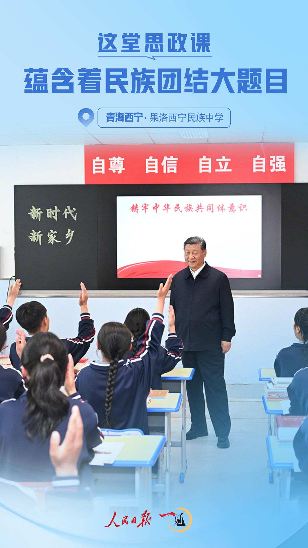 西寧城北,元朔山麓,藍(lán)天白云掩映下的果洛西寧民族中學(xué)綠意蔥蘢。6月18日,正在青海省西寧市考察的習(xí)近平總書記來到這里并觀摩了一堂思政課??倳泴λ颊n歷來很重視——這是落實立德樹人根本任務(wù)的關(guān)鍵課程,是培養(yǎng)社會主義建設(shè)者和接班人的重要保障。