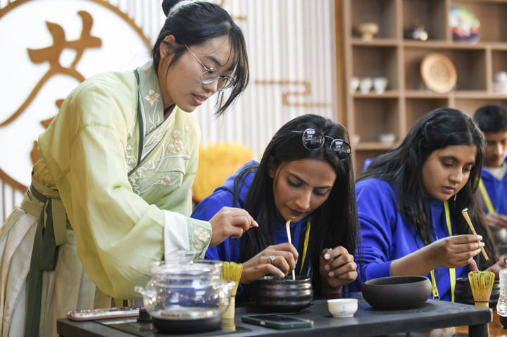 2024年4月15日,參加2024年“漢語(yǔ)橋”上合組織國(guó)家青年學(xué)生春令營(yíng)的來(lái)華青年學(xué)生在新疆師范大學(xué)學(xué)生(左)的指導(dǎo)下學(xué)習(xí)茶藝。
