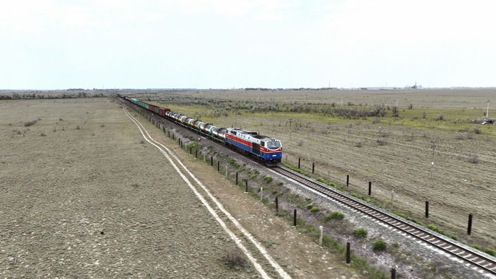 2023年5月12日,在哈薩克斯坦阿拉木圖附近,貨運(yùn)列車馳騁于阿拉木圖與中國(guó)霍爾果斯間(無(wú)人機(jī)照片)。
