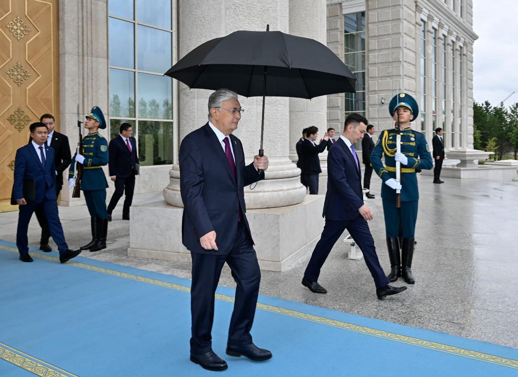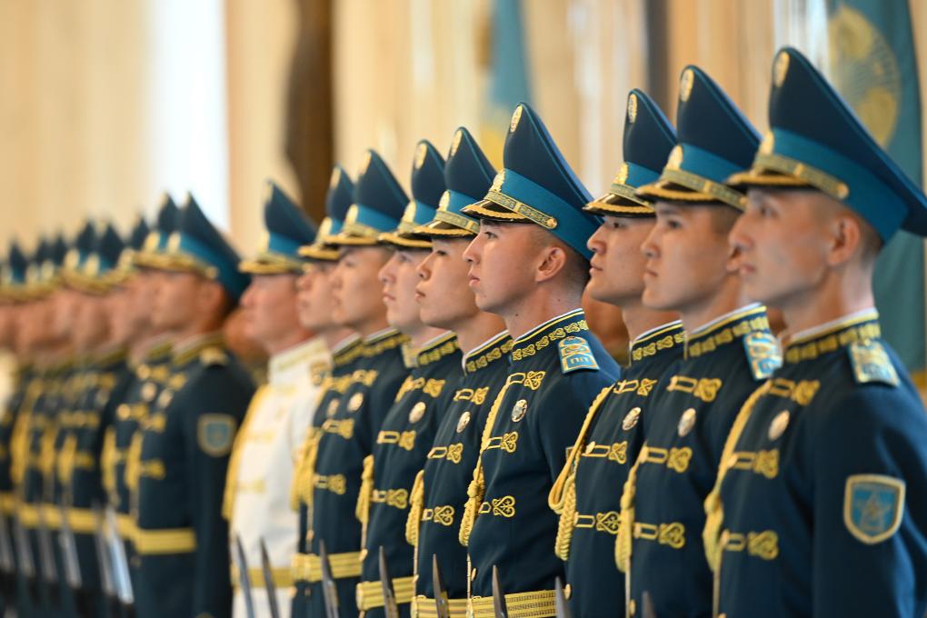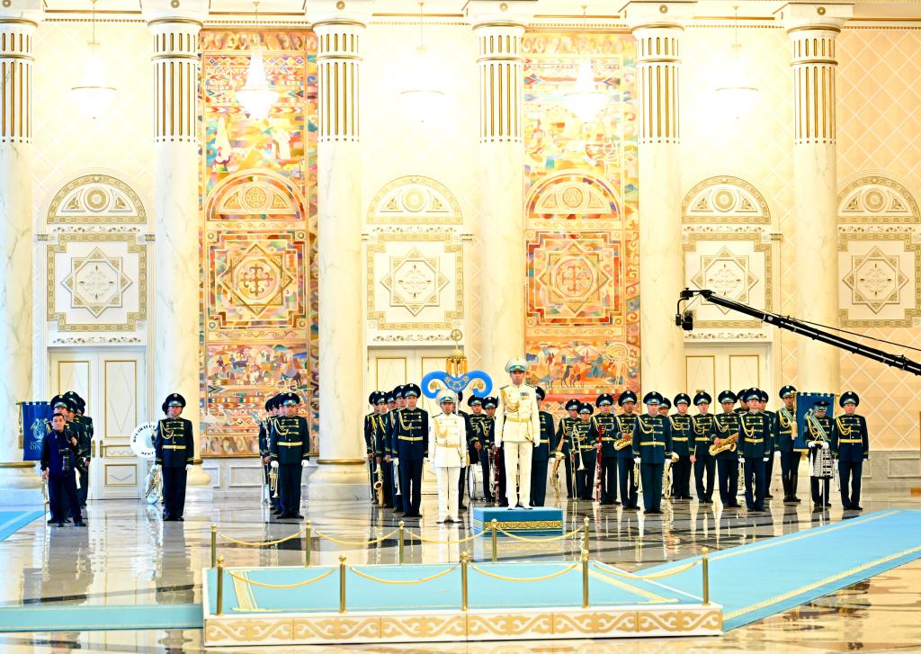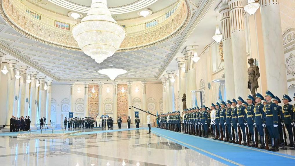 托卡耶夫?yàn)榱?xí)近平舉行隆重歡迎儀式??偨y(tǒng)府大廳氣勢(shì)恢宏,禮兵威武挺拔。兩國(guó)元首分別同對(duì)方陪同人員一一握手致意。兩國(guó)元首登上檢閱臺(tái),軍樂團(tuán)奏中哈兩國(guó)國(guó)歌。習(xí)近平在托卡耶夫陪同下檢閱儀仗隊(duì)。