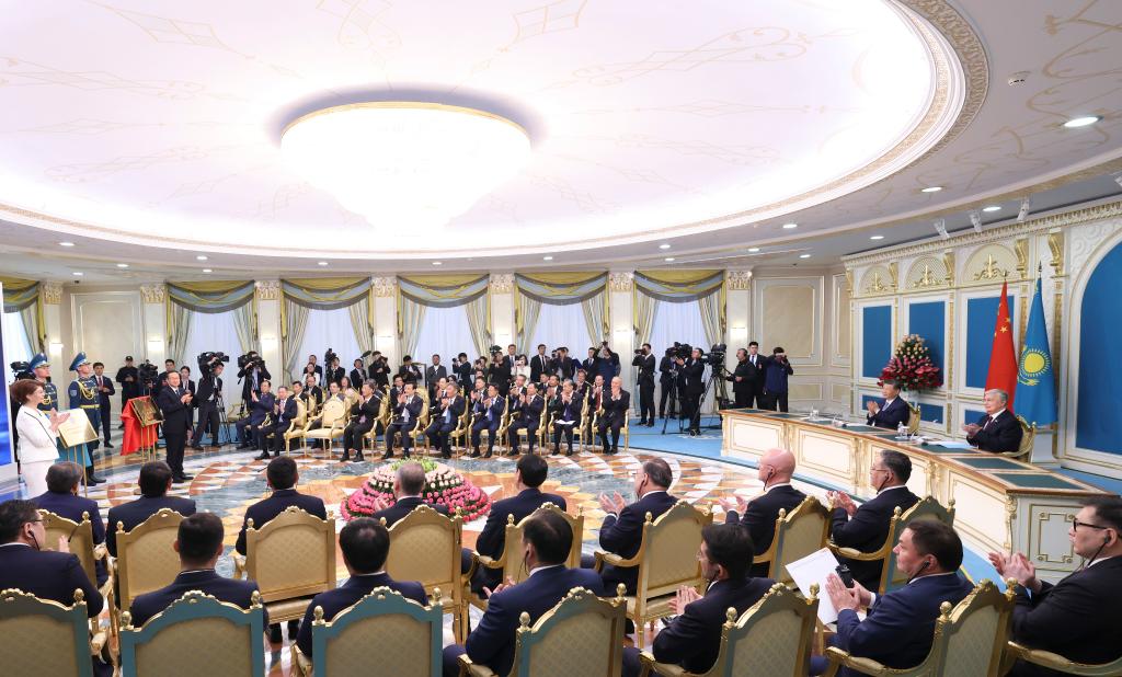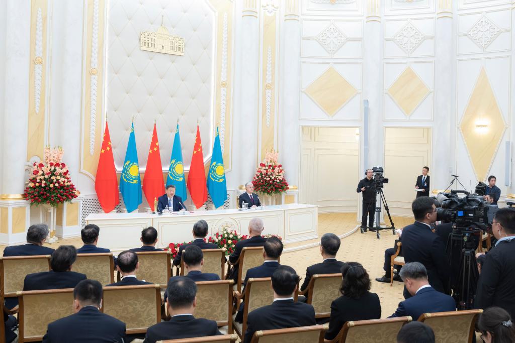 兩國(guó)元首共同簽署《中華人民共和國(guó)和哈薩克斯坦共和國(guó)聯(lián)合聲明》,并共同見證交換經(jīng)貿(mào)、互聯(lián)互通、航空航天、教育、媒體等領(lǐng)域數(shù)十項(xiàng)雙邊合作文件。