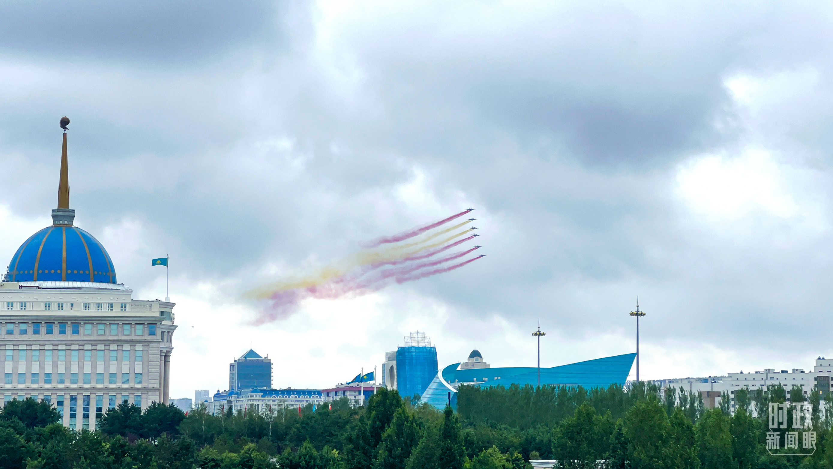 習(xí)主席乘車抵達(dá)哈總統(tǒng)府時(shí),托卡耶夫總統(tǒng)熱情迎接。六架哈薩克斯坦空軍戰(zhàn)機(jī)從總統(tǒng)府上空飛過,拉出象征中國國旗色彩的紅黃色彩煙,以最高禮儀歡迎中國貴賓。
