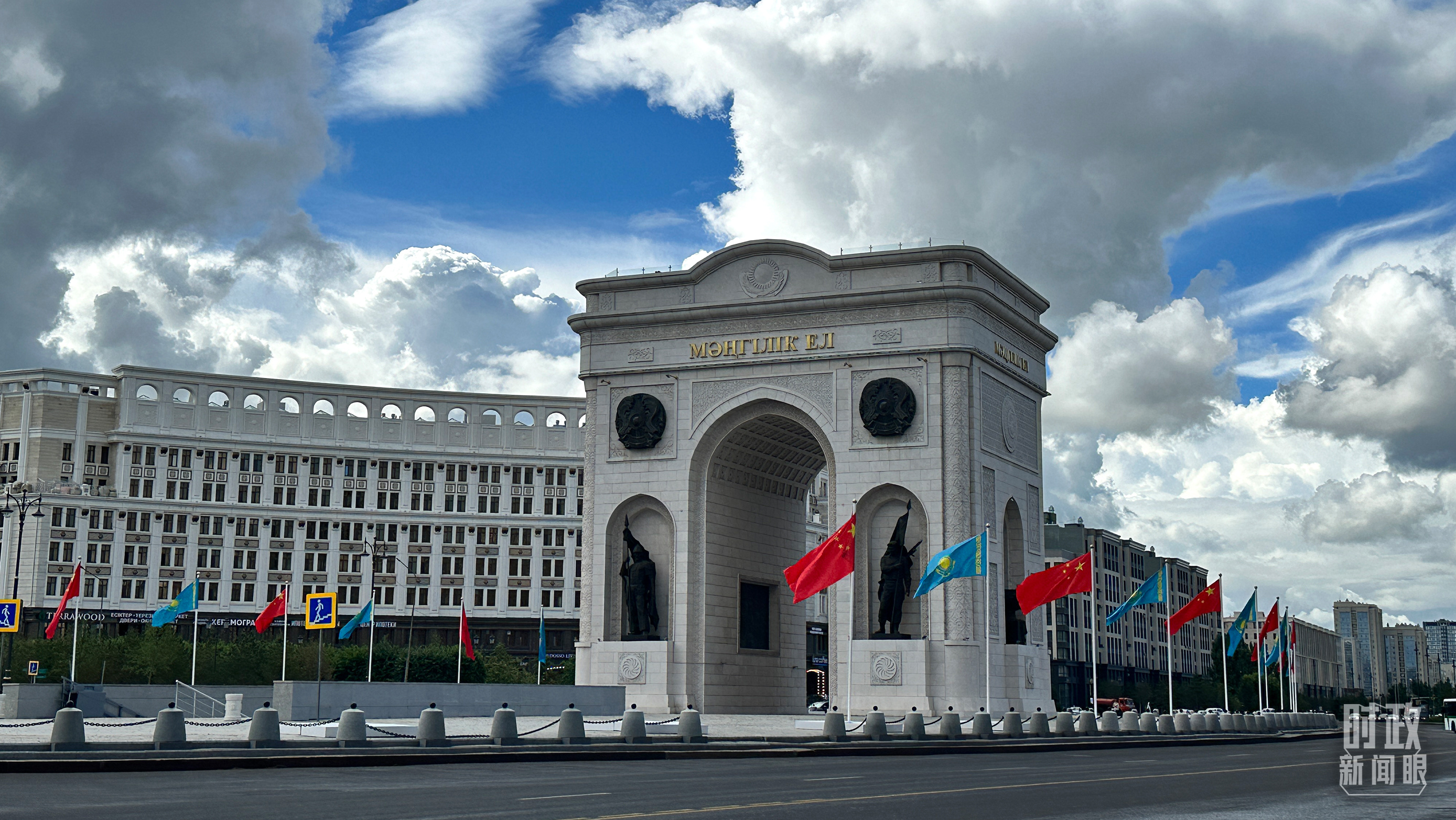 阿斯塔納地標(biāo)建筑“凱旋門”兩側(cè),中哈兩國國旗迎風(fēng)招展。(總臺(tái)央視記者關(guān)舟拍攝)