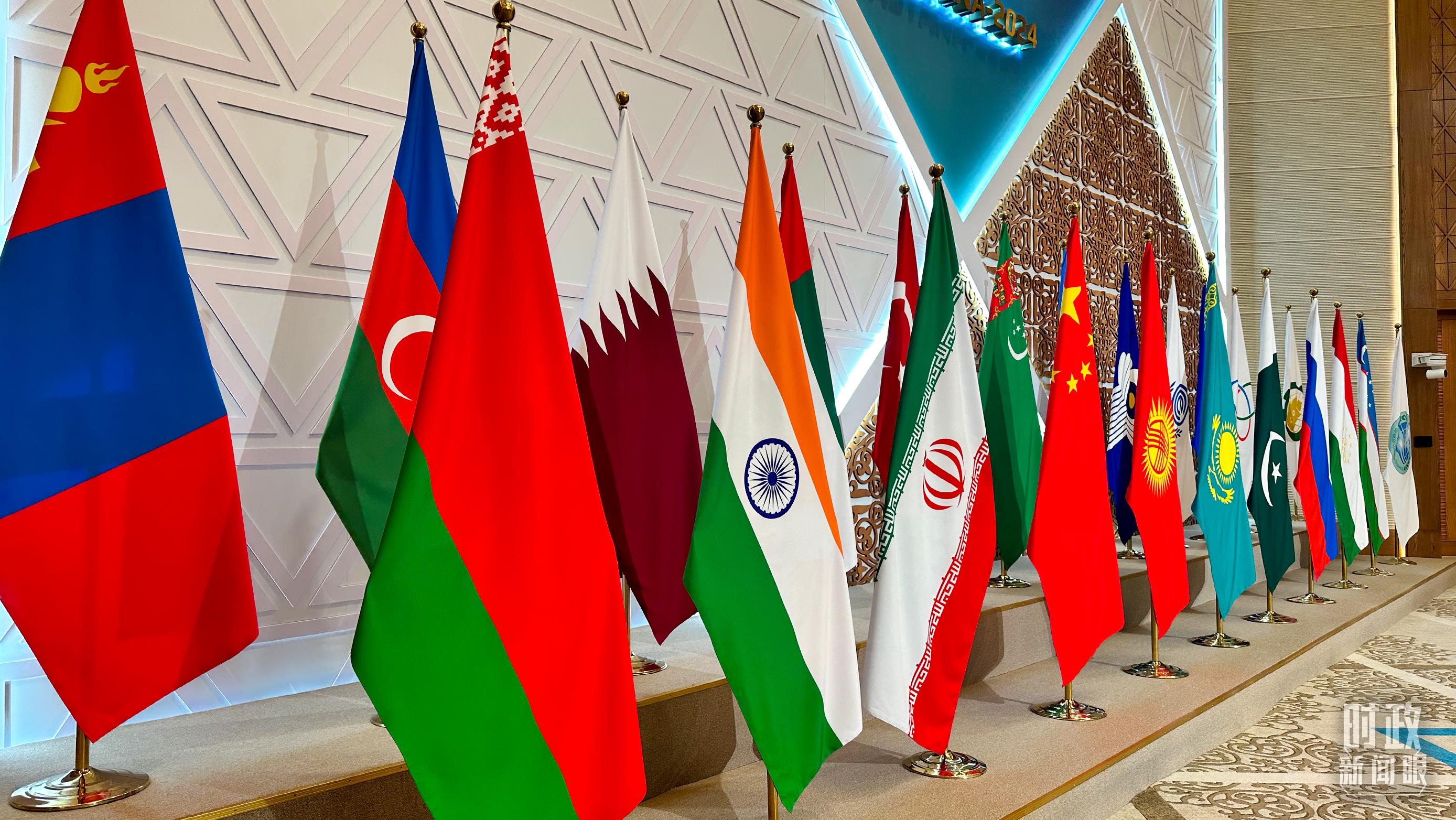 阿斯塔納峰會(huì)現(xiàn)場(chǎng)擺放的旗幟。(總臺(tái)央視記者關(guān)舟拍攝)