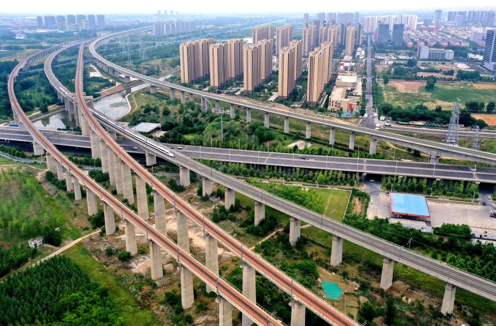 2024年5月30日,一列動(dòng)車組列車行駛在鄭州東站附近的線路上。(新華社發(fā))